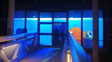 Pour le festival de Lausanne Lumières, Stéphane Masson fait rejaillir la rivière souterraine « Le Flon » pour créer "L’aquarium" : 214 000 litres d’eau et des poissons dépassant les 200 kg à découvrir dès la nuit tombée lorsque Le Flon resurgit et remplit peu à peu le sas du métro.