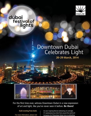Produit par la société EMAAR dans le nouveau quartier Dowtown Dubai, le 1er « Dubaï Festival of light » du 20 au 29 mars 2014, a été accompagné par La Fête des Lumières de Lyon pour sa mise en oeuvre.