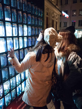 L’installation est autonome, la présence d’un spectateur déclenche la prise de vue puis l’intégration de ce nouveau portrait dans un bocal. Au bout d’un certain nombre de captations, les bocaux se vident, prêts à conserver les prochains curieux.
